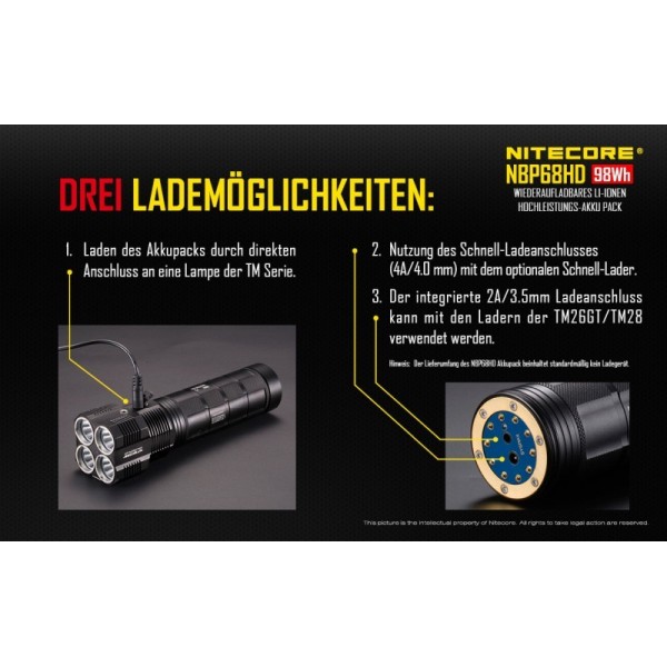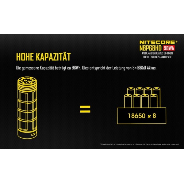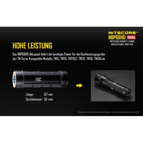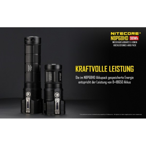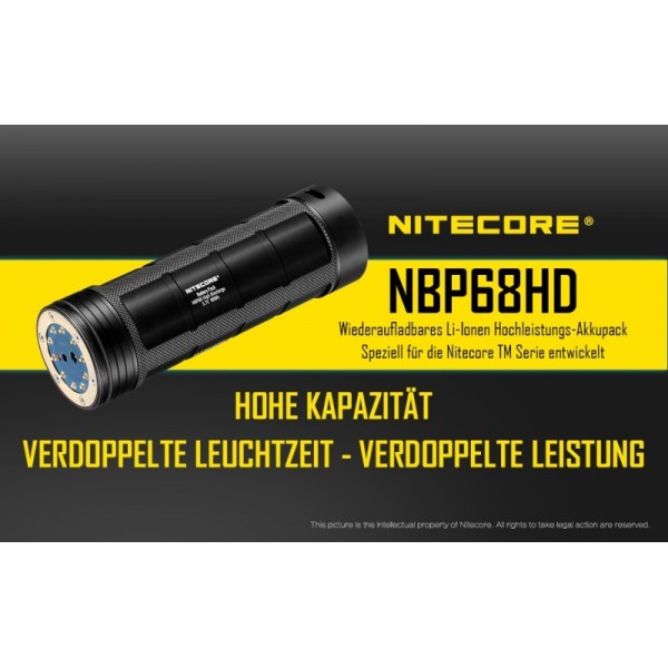 Das Nitecore BP68HD Akkupack ist die optimale Stromversorgung für die folgenden Modelle der Tiny Monster Reihe: TM26, TM26GT, TM28, TM38, TM38Lite. Das Akkupack leistet 98Wh bei 3,7V Nennspannung. Das Laden des Akkupacks ist über die Ladegeräte der Lampe oder direkt möglich.