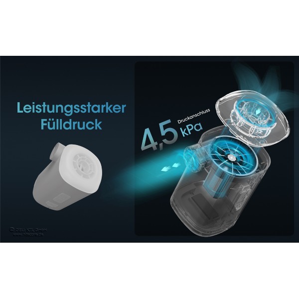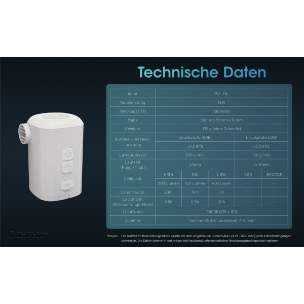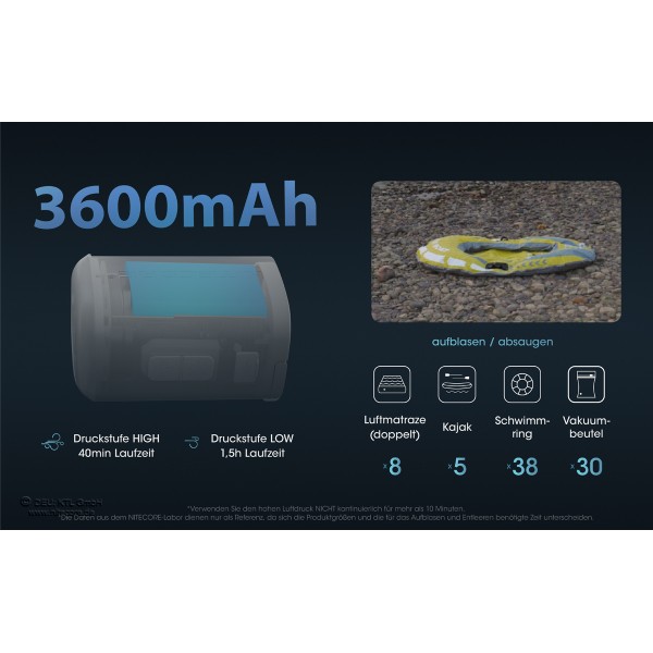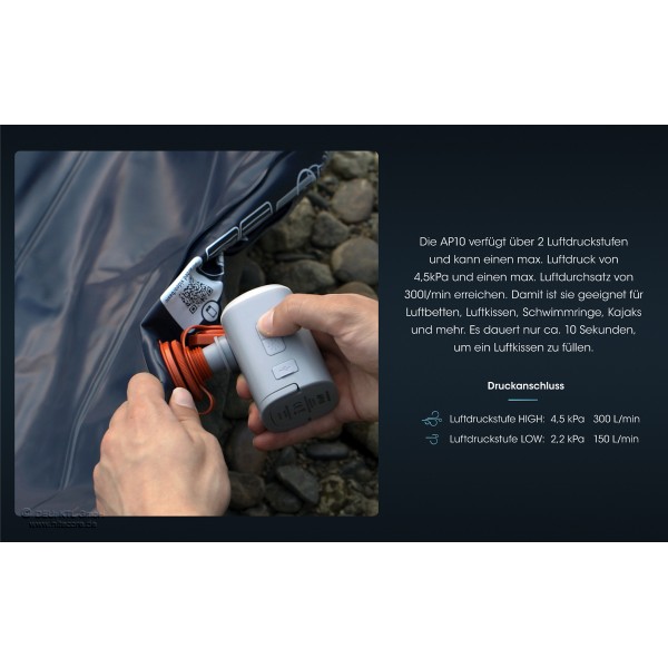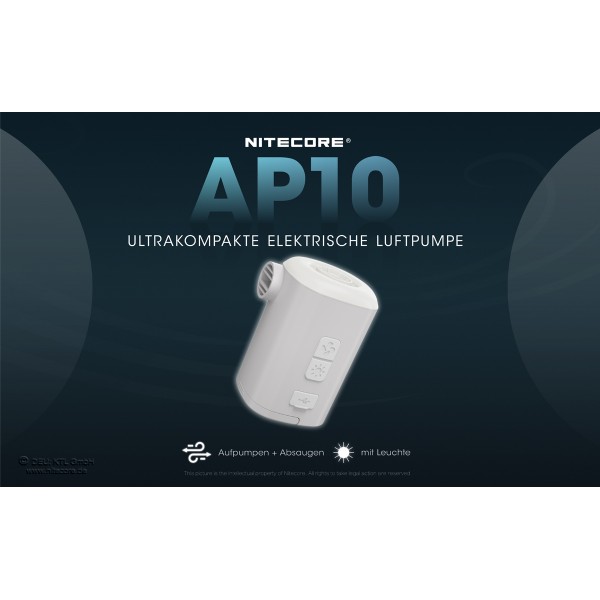 Nitecore AP10 ist eine handliche elektronische Akku-Pumpe. Die AP10 kann zum Aufblasen und Absaugen verwendet werden. Die Nitecore AP10 verfügt über zwei Gebläsestufen mit bis zu maximal 300 Liter Volumen/min und eignet sich daher ideal zum Aufbalsen von Schwimmringen, Luftmatratzen oder kleinen Schaluchbooten.