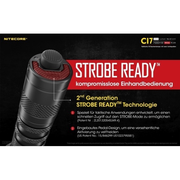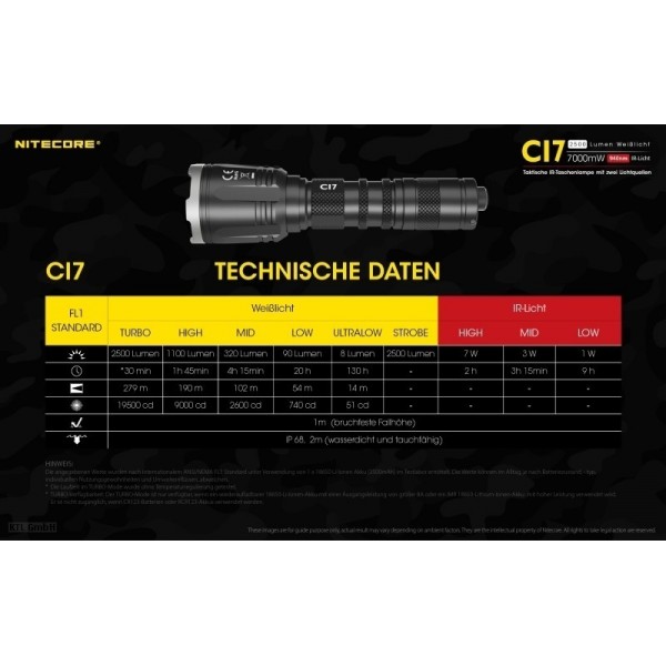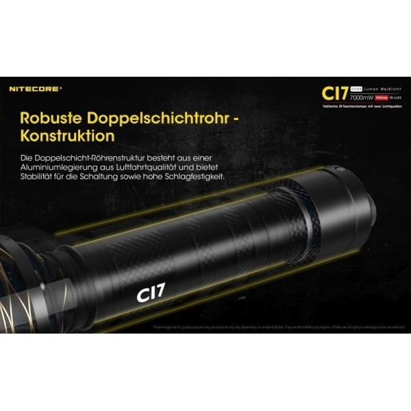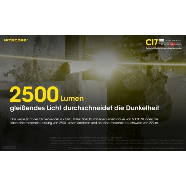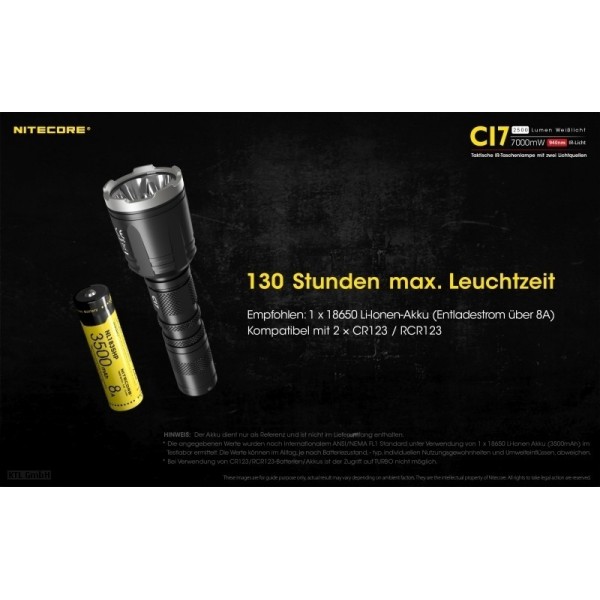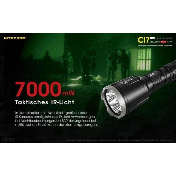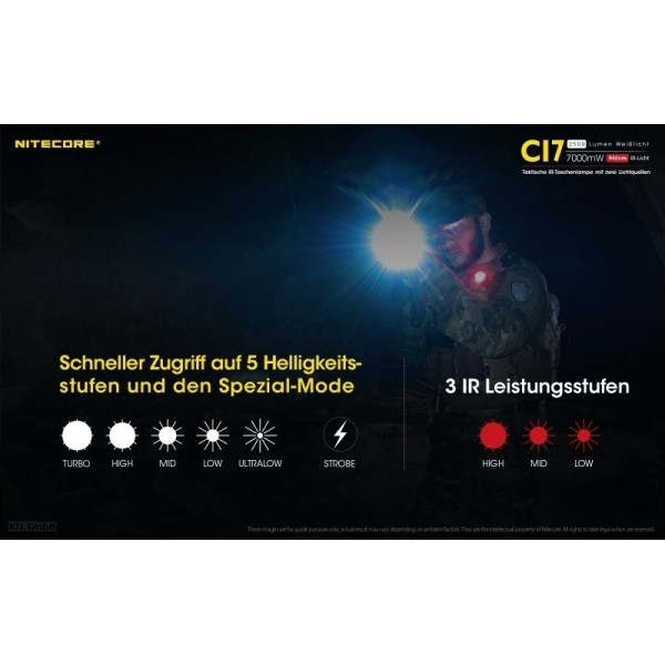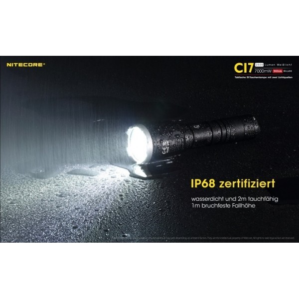 Die Nitecore CI7 ist eine taktische Taschenlampe mit 2500 Lumen Weißlicht und einem IR-Licht mit max. 7W. Die CI7 ist mit je 4 LED´s