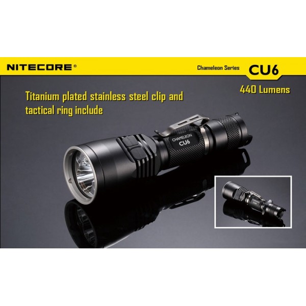 Lieferumfang: NiteCore Chameleon CU6, Tactical Ring, Holster, Lanyard, Ersatz-Dichtring, Ersatz-Gummi-Endkappe, Clip