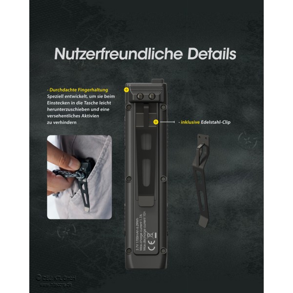 Eine Kombination eines kohlefaserverstärkten Polymerrahmens und Edelstahl verschaffen der EDC27 die gewünschte Robustheit. Die Temperatursteuerung und Kupfereinlagen sorgen für die höchste Nutzungsdauer und optimale Wäremeableitung. Über das OLED-Display erhält der Nutzer nützliche Informationen zum Zustand der Lampe. Der integrierte Li-Ion Akku mit 1700mAh wird mittels USB-C-Ladeport geladen.