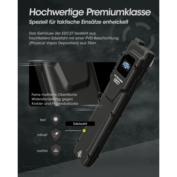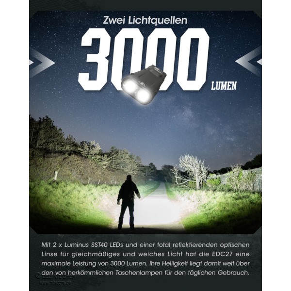 Mit der EDC27 beweist Nitecore mal wieder Kreativität und Innovation. Ein komplett neuartiges Design, ein hochwertiges pulverbeschichtetes Gehäuse, OLED-Display und 3000 Lumen maximal Leistung. Die Nitecore EDC27 setzt neue Maßstäbe.