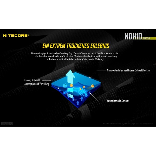 Das äusserst angenehm zu tragende Nitecore Combat Hat Cap NDH10 ist aus einem zweilagigem Material gefertigt. Die Struktur des One Way Dry Smart Gewebes nutzt den Druckunterschied zwischen den Schichten für eine schnell Absorption und eine lang anhaltende antibakterielle Wirkung. An der Stirn befindet sich eine Velcro-Fläche zum Anbringen von Patches.