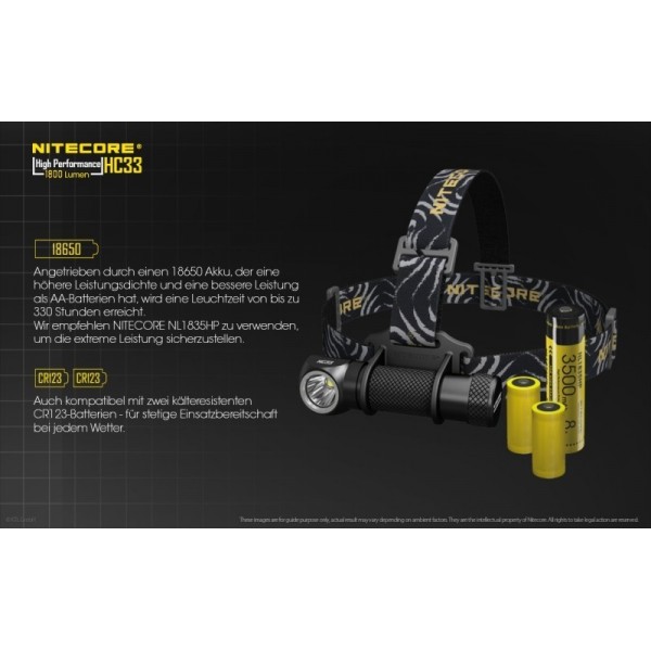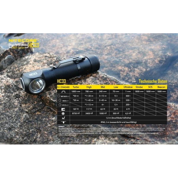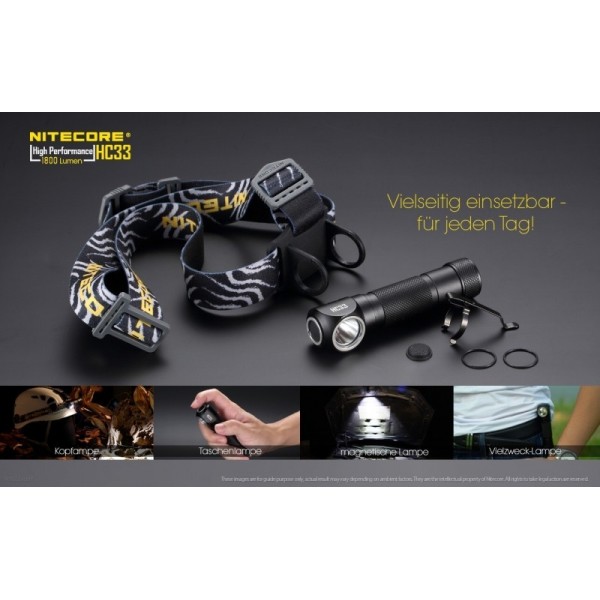 Die Nitecore HC33 ist eine leistungsgesteigerte Version der beliebten HC30. Die HC33 leistet maximal 1800 Lumen (bei Verwendung des mitgelieferten Akkus NL1835HP).