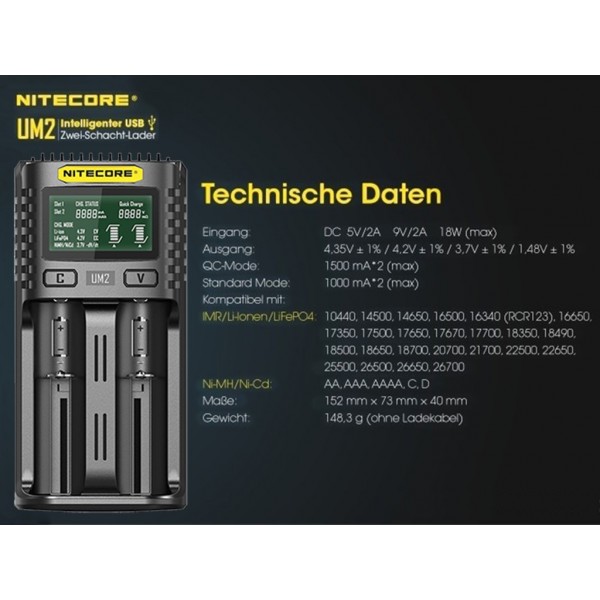 Das Nitecore UM2 Ladegerät erkennt den Akku Typ, ermittelten Akkuzustand, den Ladezustand des Akkus und legt automatisch das richtige Ladeverfahren fest. Laden von Akkus bis eine Länge von 77mm z.B: Geschützte 20700/21700 Akkus, automatische Akku-Innenwiderstands Erkennung, Berechnung der geladenen Kapazität sowie Li-Ionen Akku Reaktivierung sind weitere sinnvolle Ergänzungen.