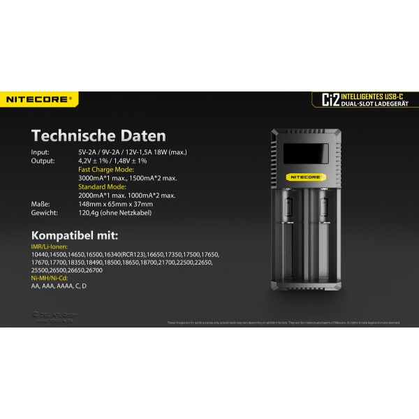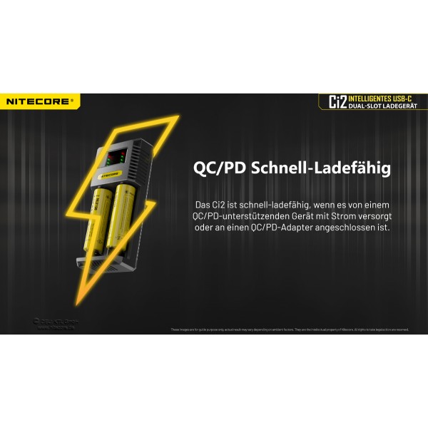 Das Nitecore Ladegerät CI2 ist ein USB-C Ladegerät mit zwei Ladeschächten. Kompatibel mit Li-Ion, NiMH und Ni-Cd Akkus. Mit dem entsprechenden Ladeadapter (QC/PD Adapter) kann an einem Ladeschacht einen Ladestrom von 3A erreicht werden.