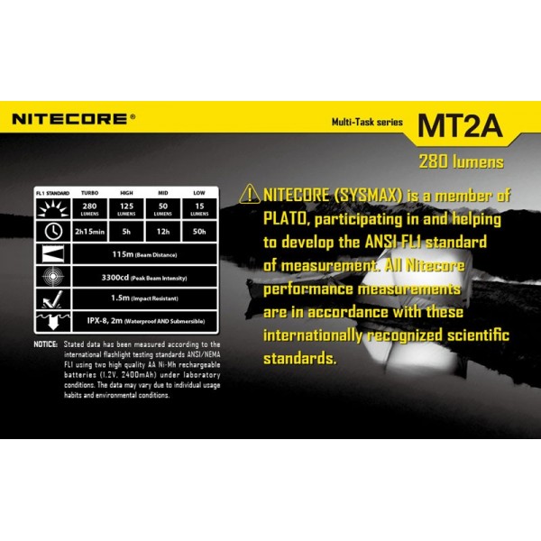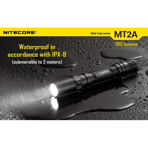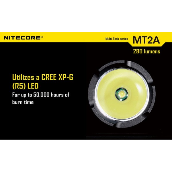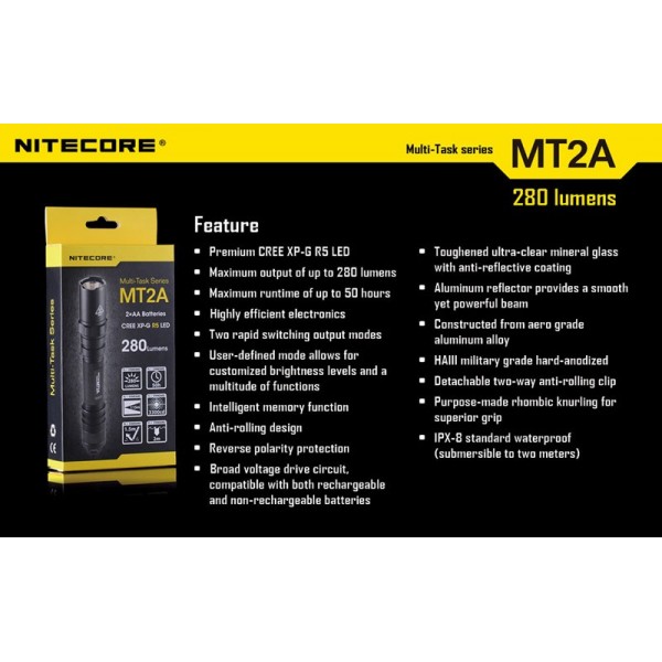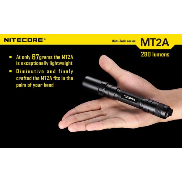Die MT2A gehört zur neuen Multi Task-Serie von NiteCore. Alle Modelle dieser Serie verfügen über 4 Leuchtstufen, Strobe und SOS. Die maximale Leuchtstärke wird bei fest angezogenem Lampenkopf erreicht.