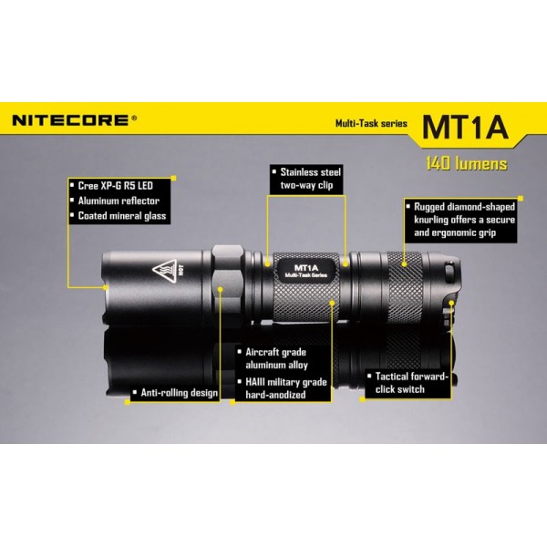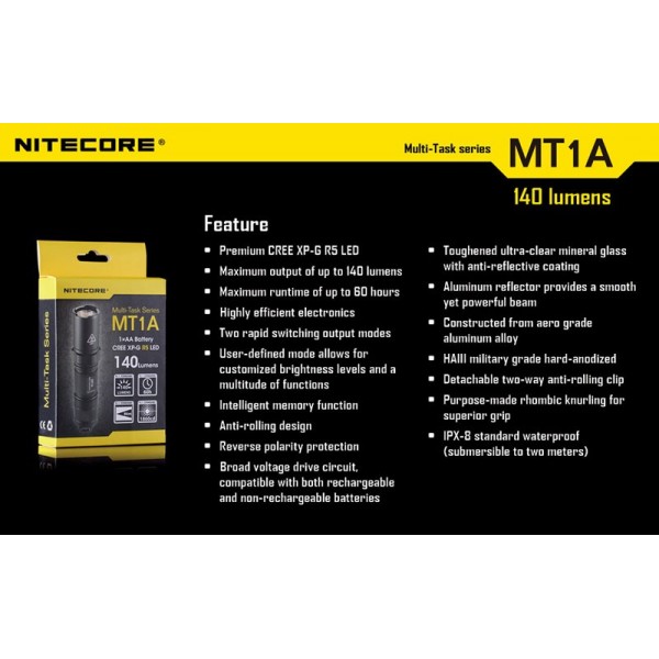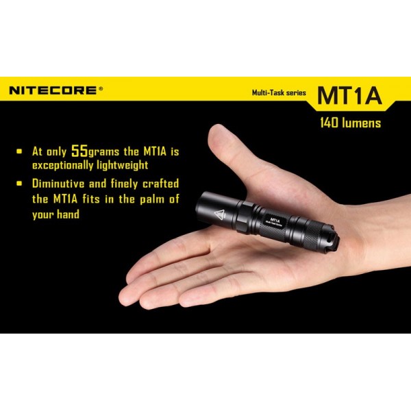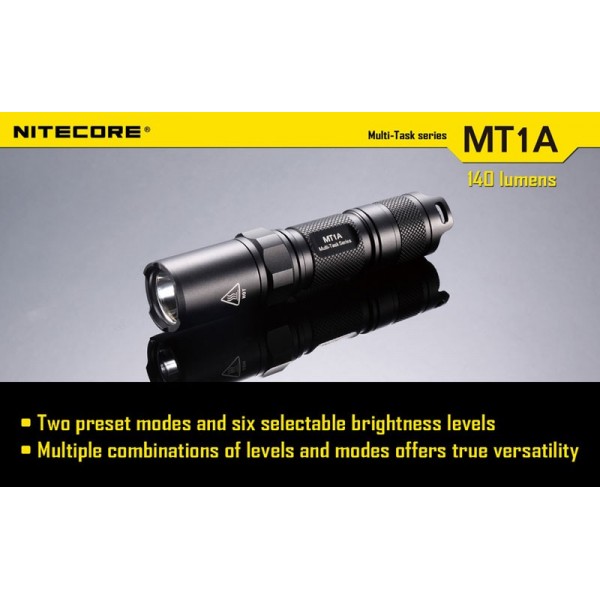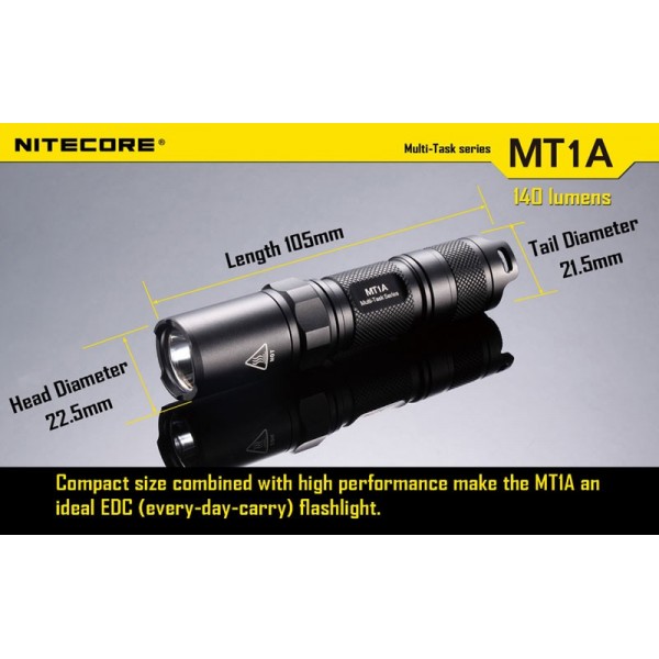 Die MT1A gehört zur neuen Multi Task-Serie von NiteCore. Alle Modelle dieser Serie verfügen über 4 Leuchtstufen, Strobe und SOS. Die maximale Leuchtstärke wird bei fest angezogenem Lampenkopf erreicht.