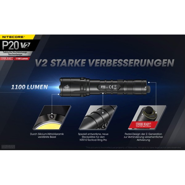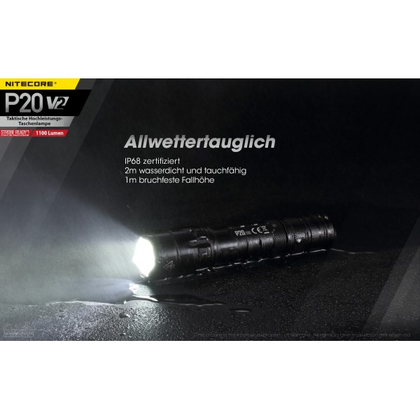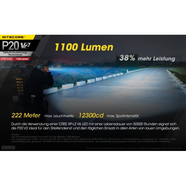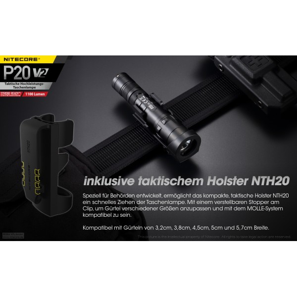 Lieferumfang: Nitecore P20 V2, Tactical Holster NTH10, , Lanyard, Batteriemagazin für CR123A Batterien, Ersatz-Dichtring, Ersatz-Gummi-Endkappe, Clip