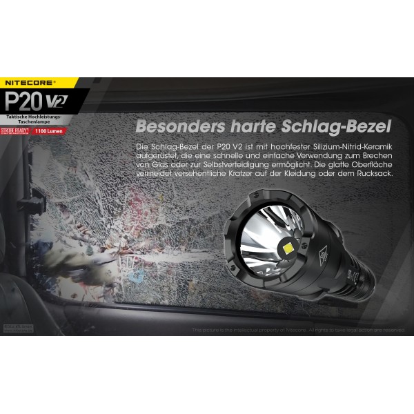 Sie verfügt jetzt über eine CREE XP-L2 V6 LED leistet maximal 1100 Lumen (bei Betrieb mit 2 x CR123A Lithium Batterien). Ebenfalls neu ist der überarbeitete Endschalter mit STROBE Ready Button, Glasbrecher mit