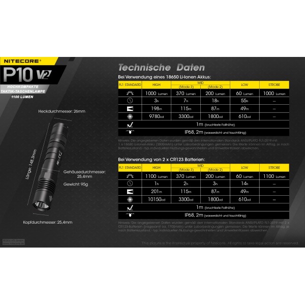 Die Nitecore P10 V2 ist der Nachfolger der P10GT. Die hier neu verwendete CREE XP-L2 V6 LED leistet maximal 1100 Lumen. 1100 Lumen werden nur bei Verwendung von 2 x CR123A Lithium Batterien erreicht. Bei Betrieb mit 1 x 18650 Li-Ion Akku sind maximal 1000 Lumen möglich.