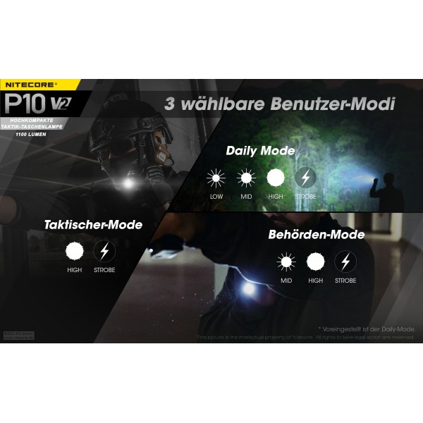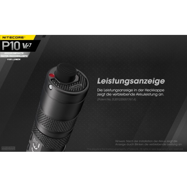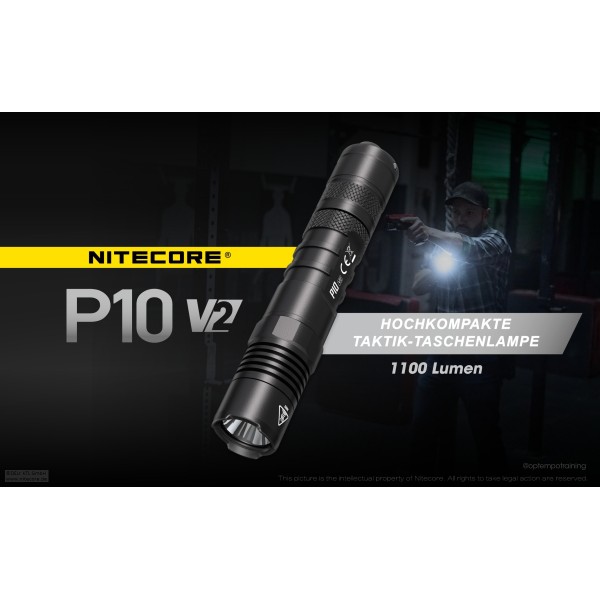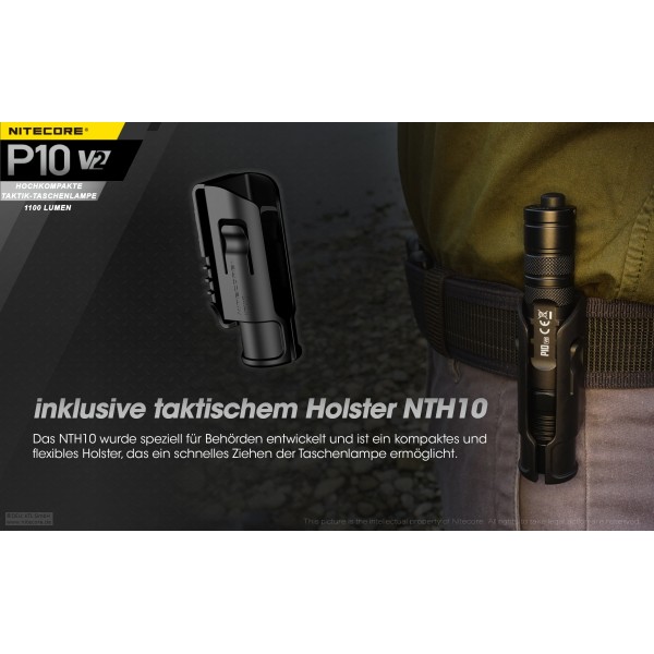 Lieferumfang: Nitecore P10 V2, Tactical Ring, Lanyard, Taktisches Holster NTH10, Batteriemagazin, Ersatz-Dichtring
