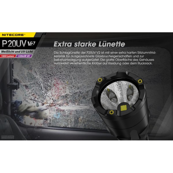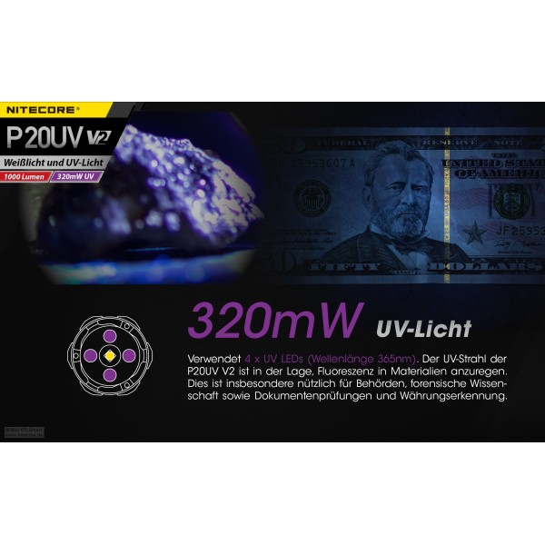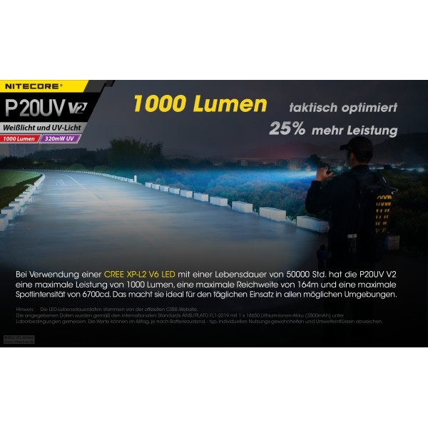 Die neue Nitecore P20UV V2 ist das Nachfolge-Modell der P20UV und gehört zur Precise-Serie von Nitecore. Die taktische Taschenlampe P20UV V2 hat einige Neuerungen erfahren. Sie verfügt jetzt über eine CREE XP-L2 V6 LED leistet maximal 1000 Lumen. Ebenfalls neu ist der überarbeitete Endschalter mit STROBE Ready Button, Glasbrecher mit Ceramic-Einsätzen und Aufnahmemöglichkeiten für den Tactical Ring NTR10 (optionales Zubehör). Das UV-Licht hat eine Leistung von 320mW und eine Wellenlänge von 365nm.