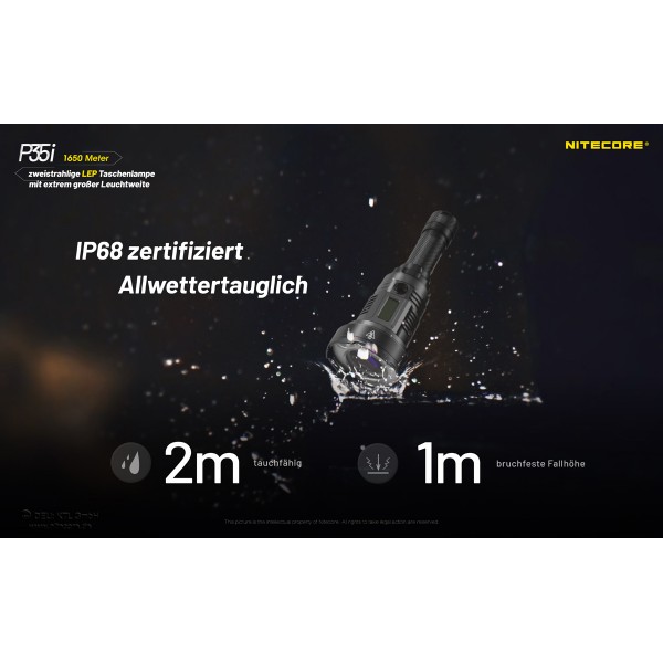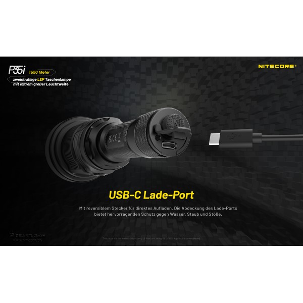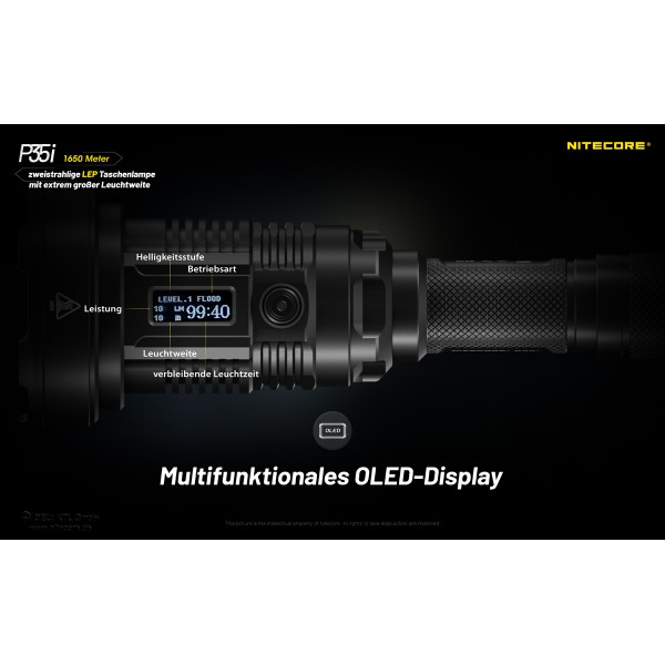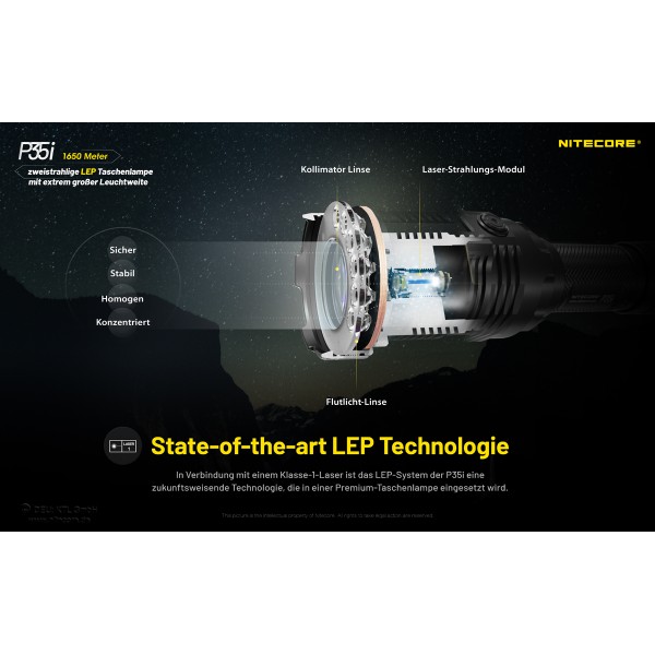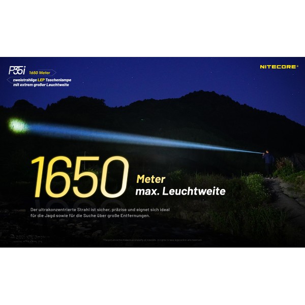 Die Nitecore P35i ist ein neues Modell aus der P-Serie kombiniert mit den Eigenschaften der i-Generation Modellen. Die P35i ist mit 6 Stück CREE XP-G3 LEDs sowie einem legalen Class 1 Weisslicht-Laser ausgestattet. Dadurch ist eine enorme Leuchtweite von 1650 Metern erreichbar.