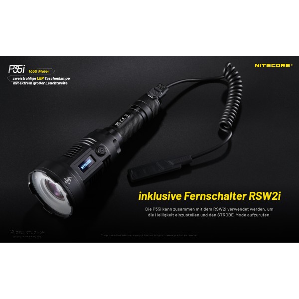 Lieferumfang: Nitecore P35i, 21700 Li-Ion Akku TYP NL2150HPi mit 5000mAh, Fernschalter RSW2i (nur Kabel), Holster, Ersatz-Dichtring, Batteriekäfig, USB-C-Ladekabel