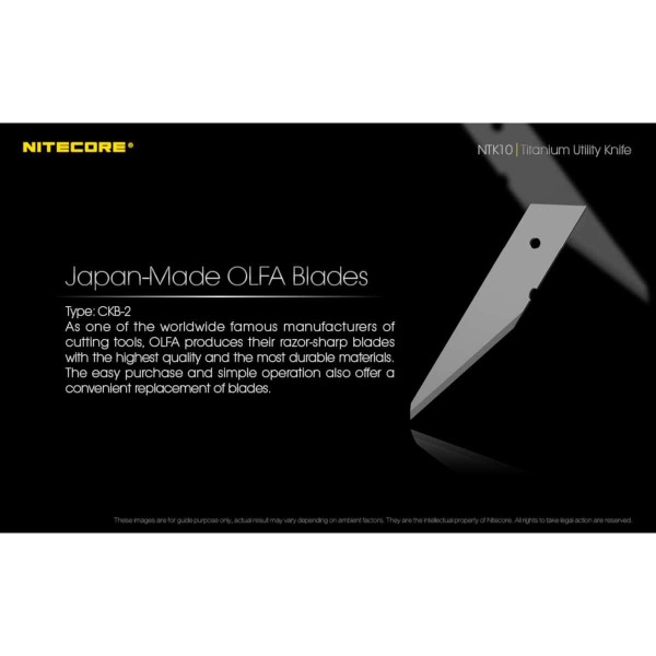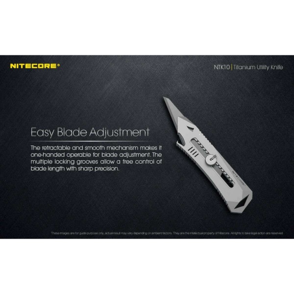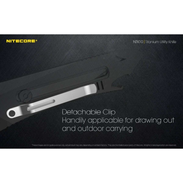 Das universell einsetzbare NiteCore Messer NTK10 ist klein, hat eine sehr hohe Festigkeit und eine starke Korrosionsbeständigkeit. Durch die Titanlegierung ist das NiteCore NTK10 Messer leicht und bietet eine erstklassige Qualität mit hervorragender Leistung. Das NTK10 wurde für ein breites Einsatzgebiet gefertigt und dient sogar als Einsatztool in der Luft- und Raumfahrt. Die Verarbeitung ist sehr präzis, die Toleranz des Titan-Gehäuses liegt laut Hersteller bei 0.001 mm.