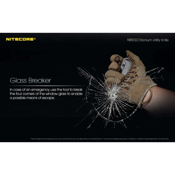 Verwenden Sie das NTK10 im Notfall als Werkzeug um die vier Ecken der Fensterscheibe zu brechen und so einen Fluchtweg zu schaffen.