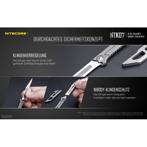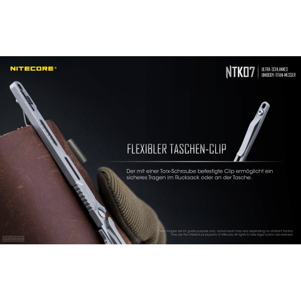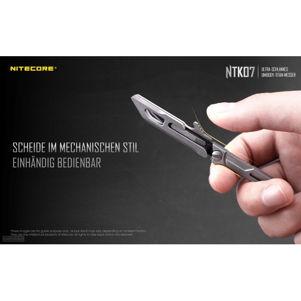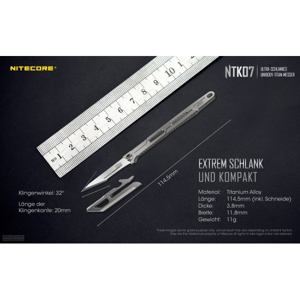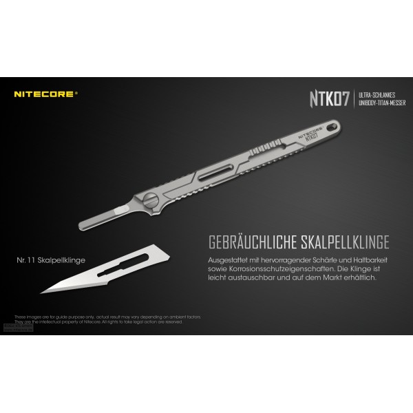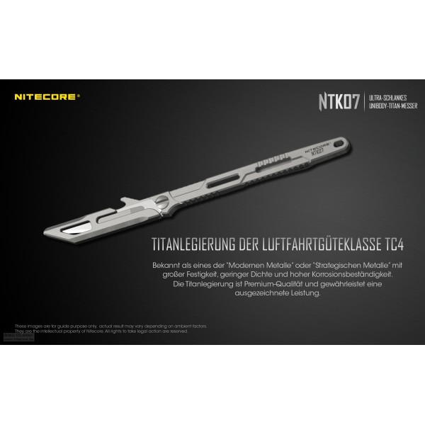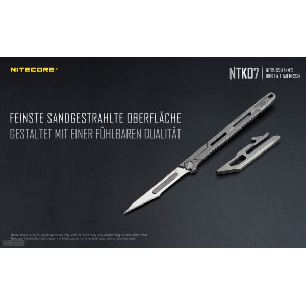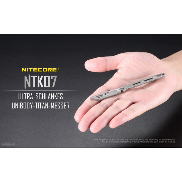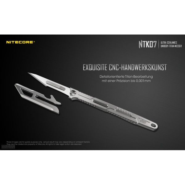 Das neue Titan Messer von Nitecore, das NTK07, ist aus TC4 Titan gefertigtes, ultraleichtes feststehendes Messer. Die Klinge (Standard-Skalpel-Klinge No. 11) ist durch eine Titan-Scheide geschützt. Das NTK07 besticht durch ein aufwendiges Design und höchste Verarbreitungsqulität. Ein ideales Werkzeug für alle filigranen Arbeiten.