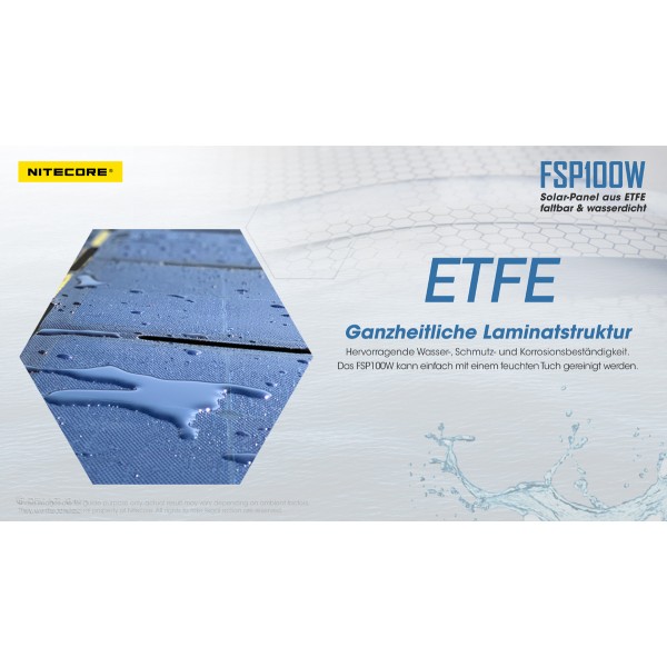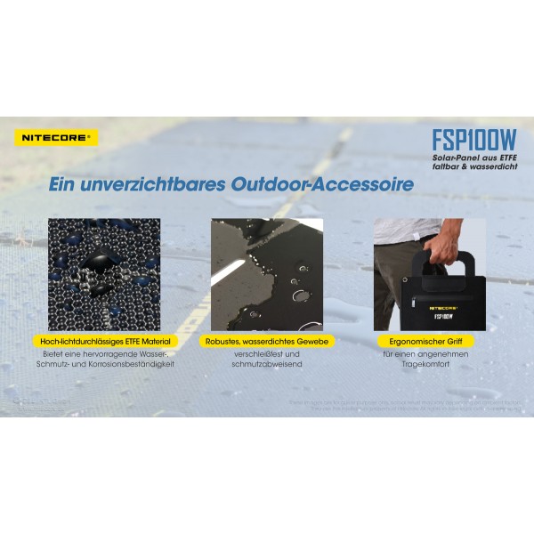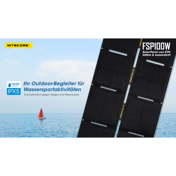 Das FSP100W von Nitecore ist ein faltbares Solar-Panel mit maximal 100 Watt Leistung und wasserfest nach IPX5 Standard. Das FSP100 besteht aus 8 einzelnen, auf einer robusten und witterungsbeständigen Nylonunterlage montierten Panelen. Die monokristallinen Panele erreichen ein hohe Effektivität auch an bedeckten Tagen.