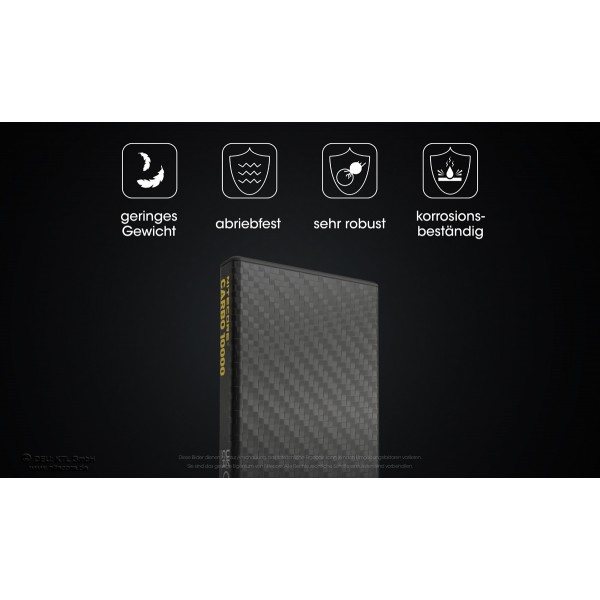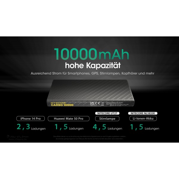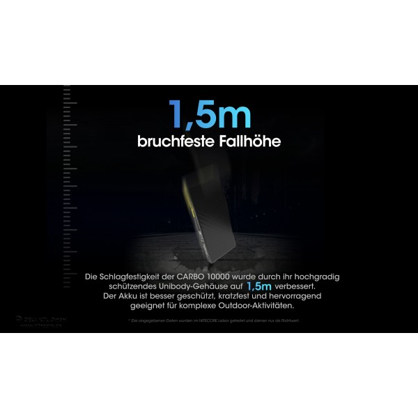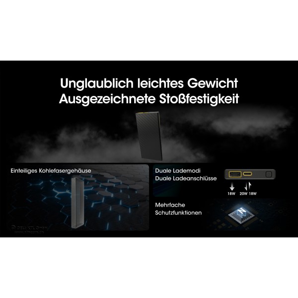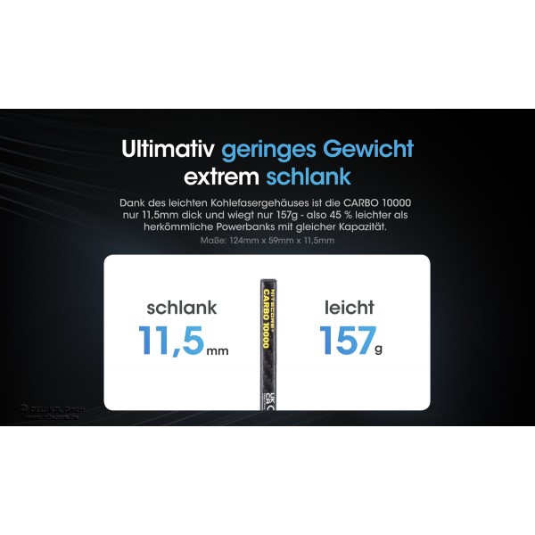 Die Nitecore Powerbank CARBO10000 gehört zur neuen Produktkategorie "Power Solutions" von Nitecore. Die CARBO10000 ist eine besonders elegante, kleine Powerbank. Mit ihren Gewicht von nur ca. 157g ist die CARBO10000 eine der leichtesten 10000mAh Powerbanks am Markt. Dies geringe Gewicht wird durch ein UNIBODY Carbongehäuse erreicht.