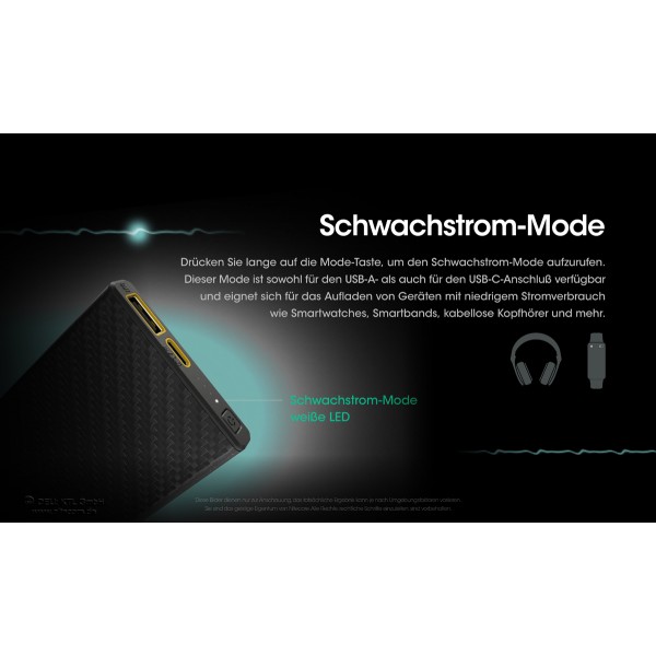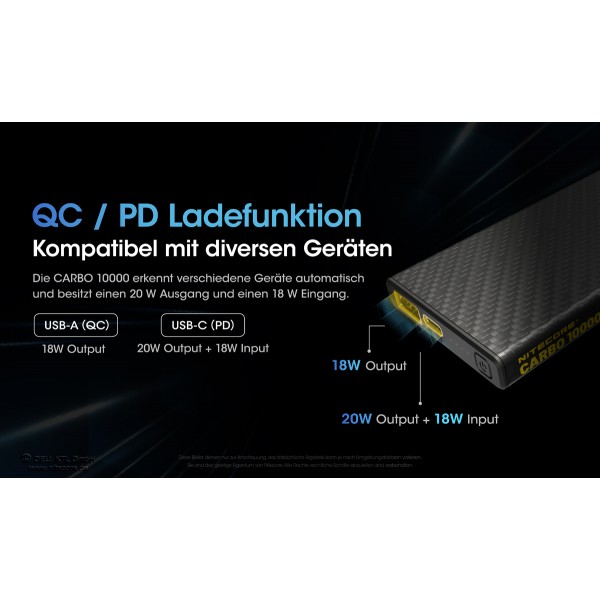 Dieses Fertigungsverfahren macht die CARBO10000 extrem robust. Die Nitecore CARBO10000 verfügt über einen USB-A- (Quick-Charge-fähig) und einen USB-C- (20W Output, 18W Input) Anschluss. Der USB-C-Port ist als PD-Port ausgelegt. Damit sich die Powerbank bei angeschlossenen Verbrauchern die nur wenig Energie benötigen nicht abschaltet, verfügt die CARBO10000 über einen LOW CURRENT Modus.
