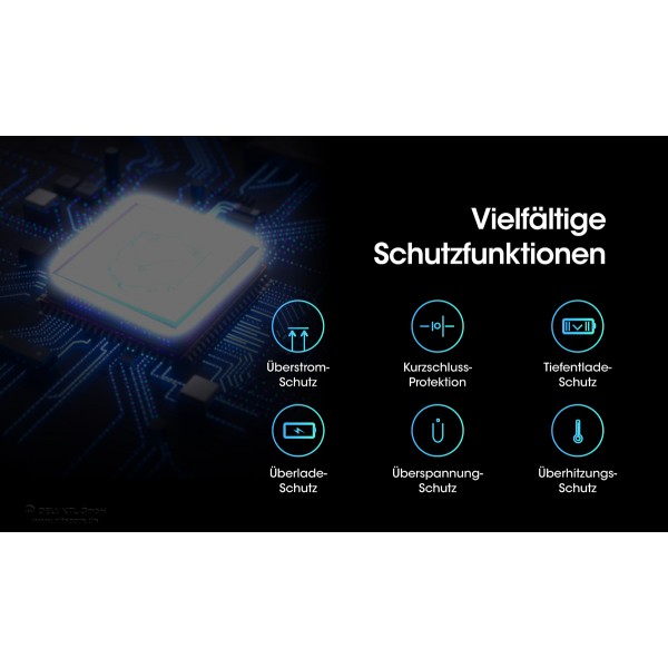 Geschützt gegen: Überladen, Kurzschluss, Tiefentladung, Überspannung, Überhitzung