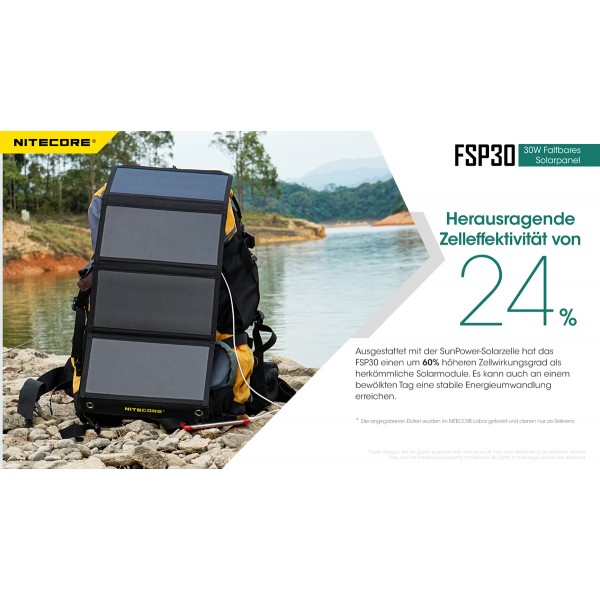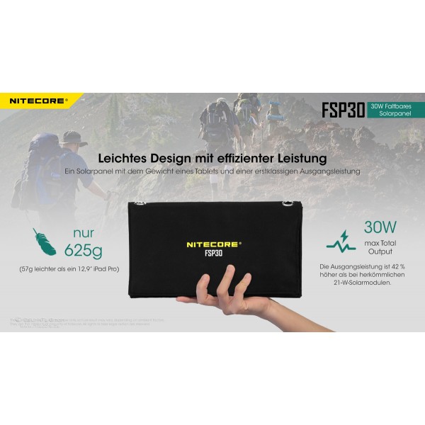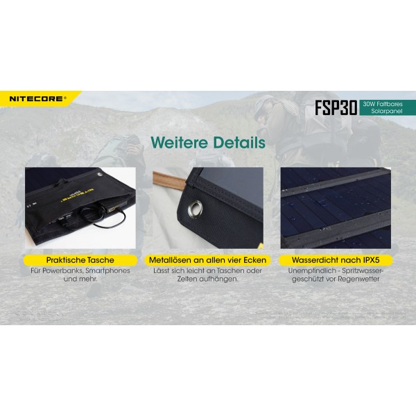 Das FSP30 von Nitecore ist ein faltbares Solar-Panel mit maximal 30 Watt Leistung. Aufgrund des kleinen Packmaßes ist es ideal für den mobilen Einsatz bei allen Outdooraktivitäten geeignet. Das FSP30 kann problemlos and der Ausrüstung, z. B. dem Rucksack, während des Wanders angebracht werden und lädt die angeschlossenen Geräte unterwegs.