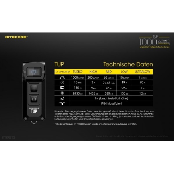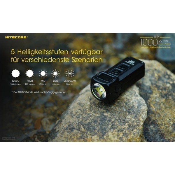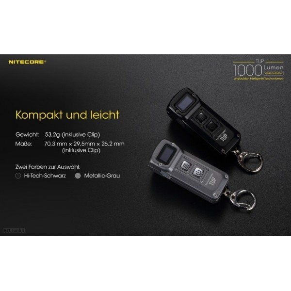 Die Nitecore TUP ist eine Schlüsselanhängerleuchte mit einer unglaublichen Lichtleistung von 1000 Lumen. Die TUP verwendet eine CREE XP-L HD V6 LED.