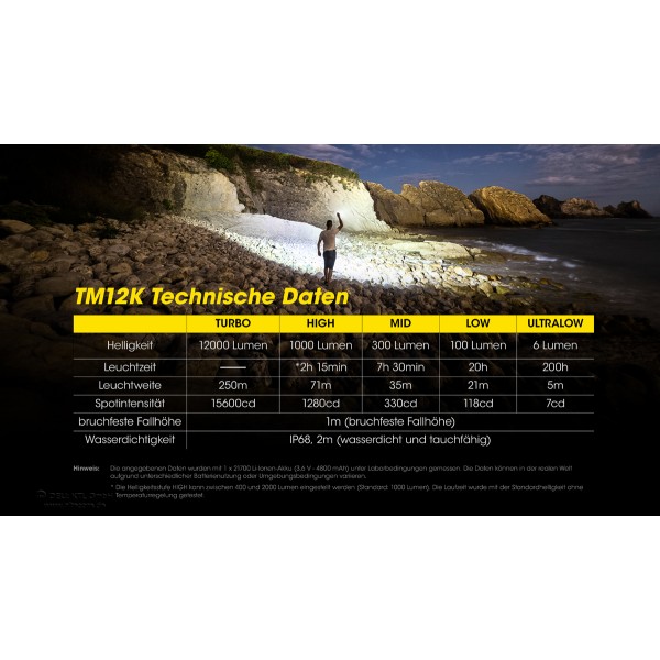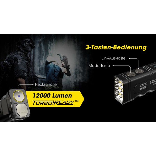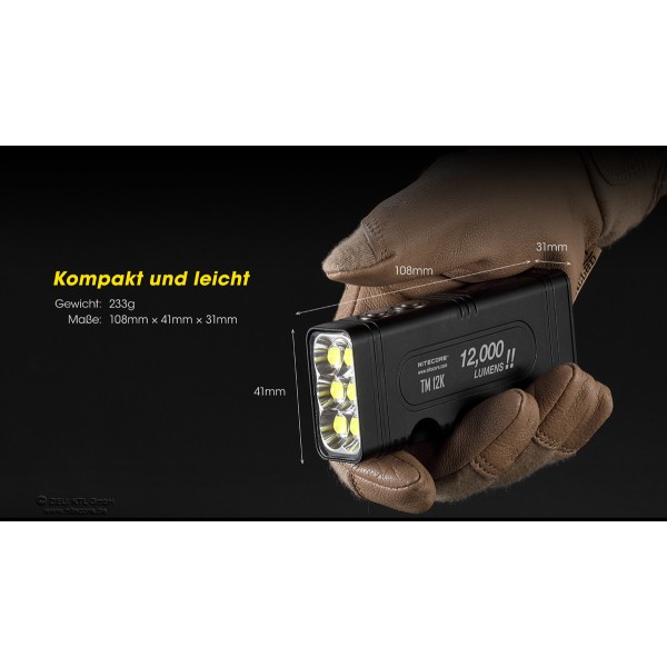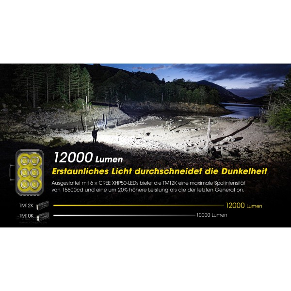 Die Nitecore TM12K ist der Nachfolger der TM10K. Höhere Leistung, ergonomisches Gehäuse, aktuelle LED´s, schnellere Ladegeschwindigkeit sowie konstruktive Verbesserungen unterscheiden die TM12K vom Vorgänger.