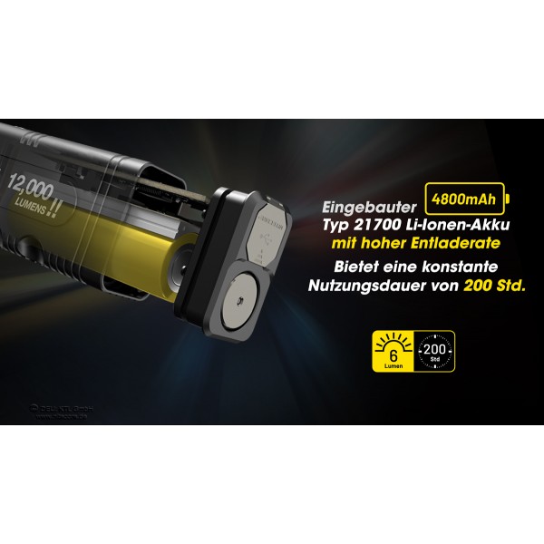 Leuchtstärke und Brenndauer (eingebauter 21700 Li-Ion Akku)